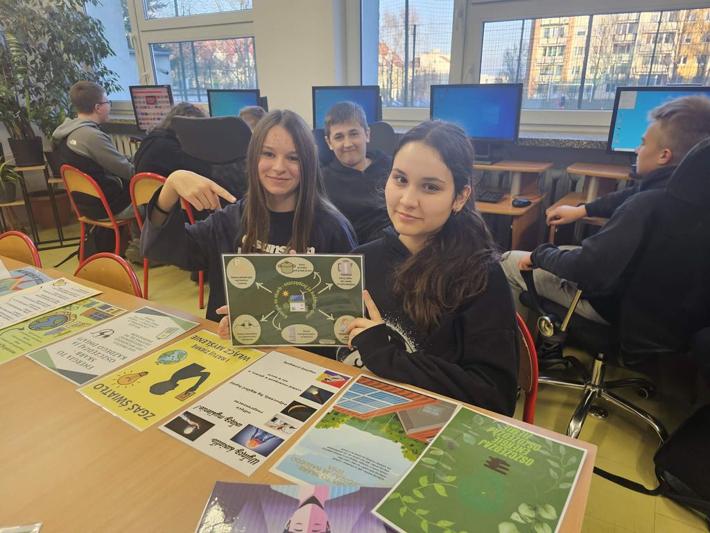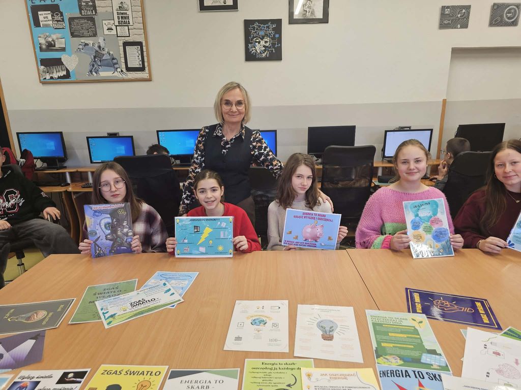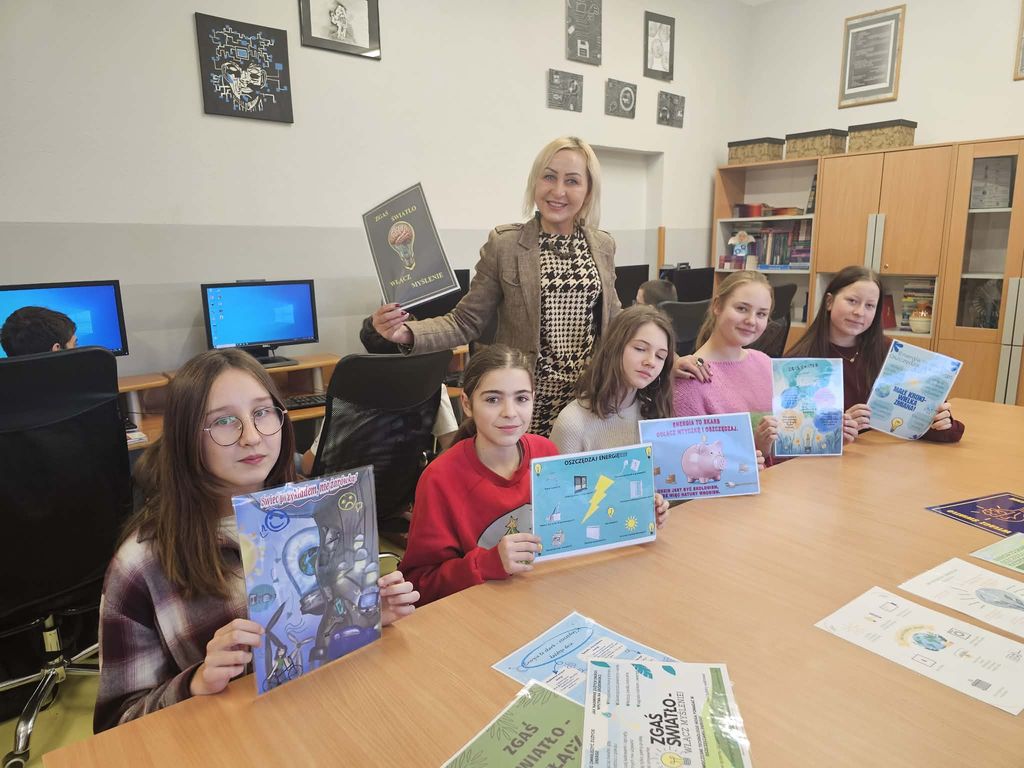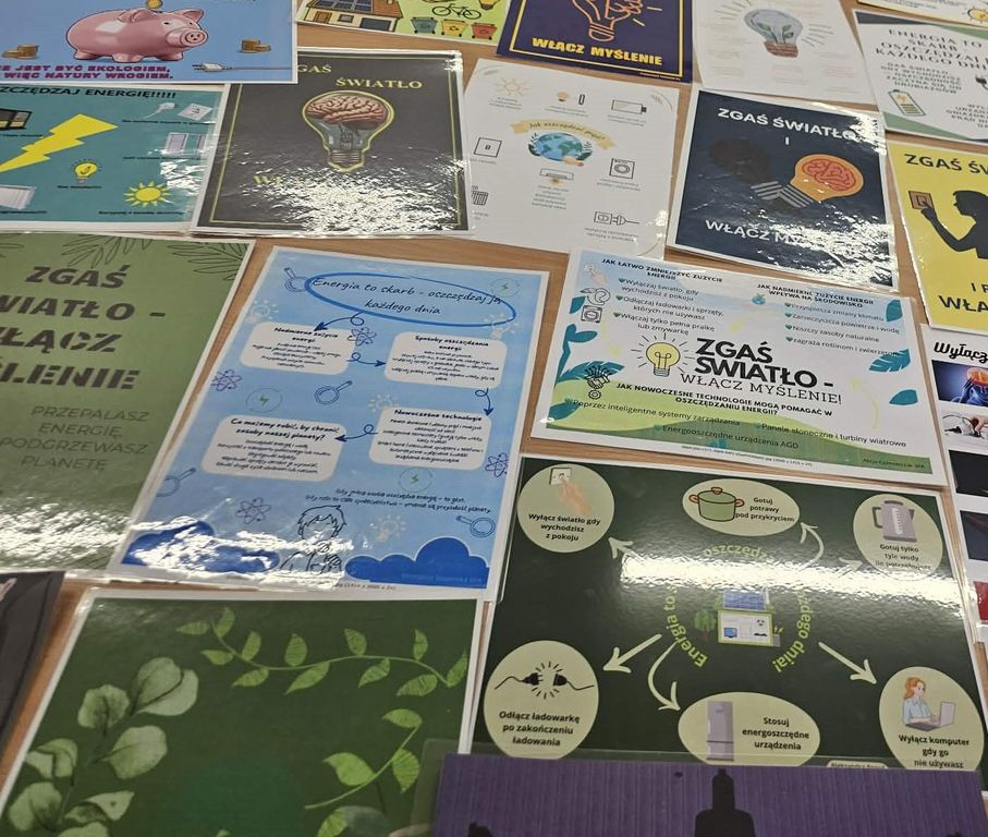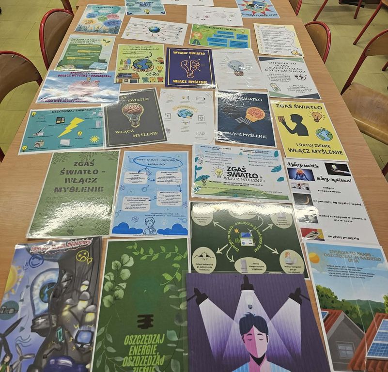 Uczniowie mieli za zadanie wykonać plakat promujący oszczędzanie energii elektrycznej w domu, w szkole lub w miejscu pracy.