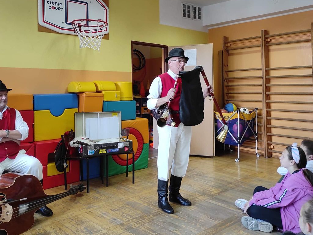 W muzyczną podróż zabrało nas dziś Lubuskie Biuro Koncertowe. Uczniowie naszej szkoły uczestniczyli w koncercie kapeli koźlarskiej „Kotkowiacy”, w czasie którego poznali stroje ludowe, dawne zwyczaje i tradycje weselne oraz instrumenty m.in.: kozła białego weselnego, kozła czarnego oraz sierszenki pasterskie.