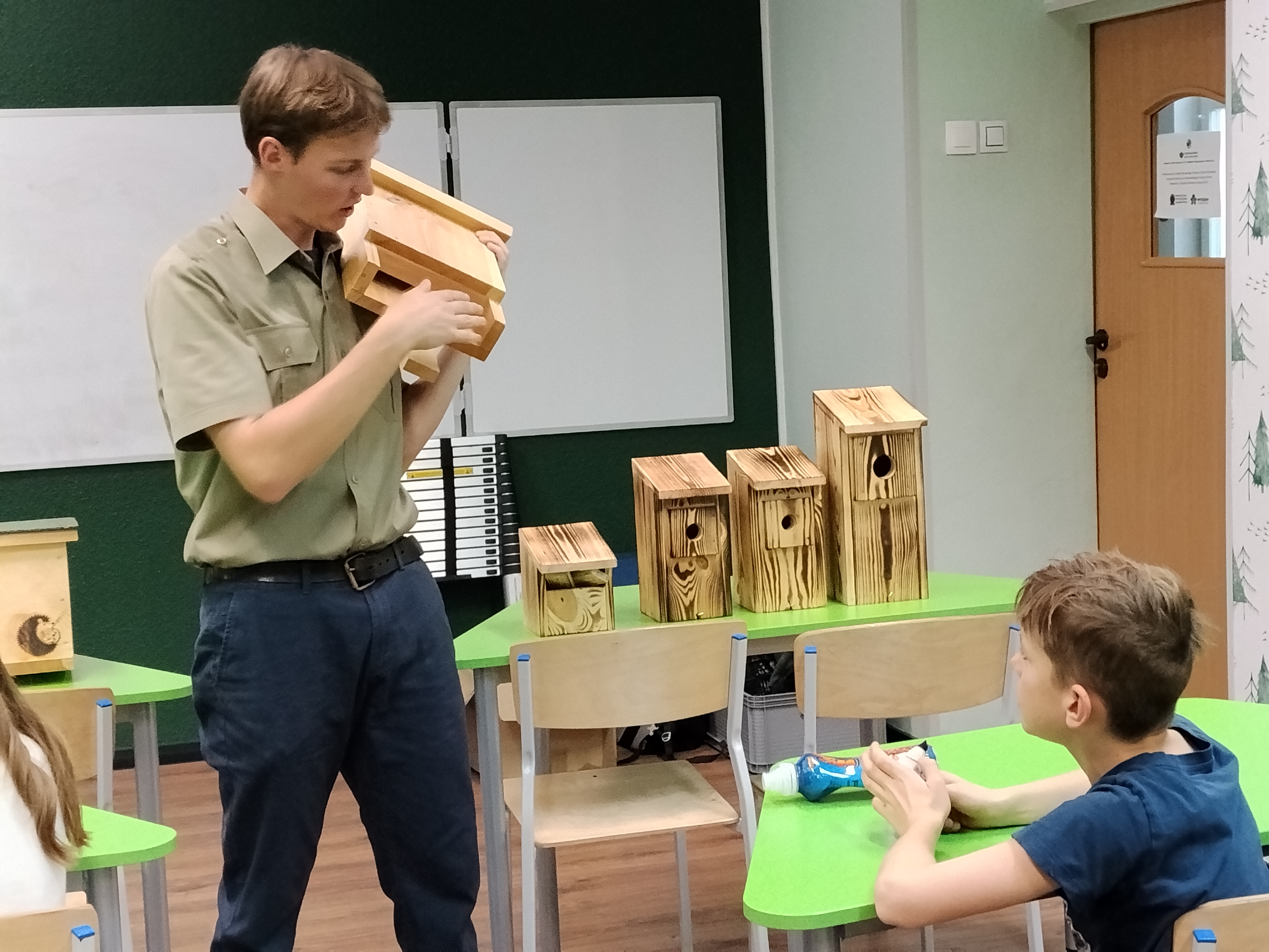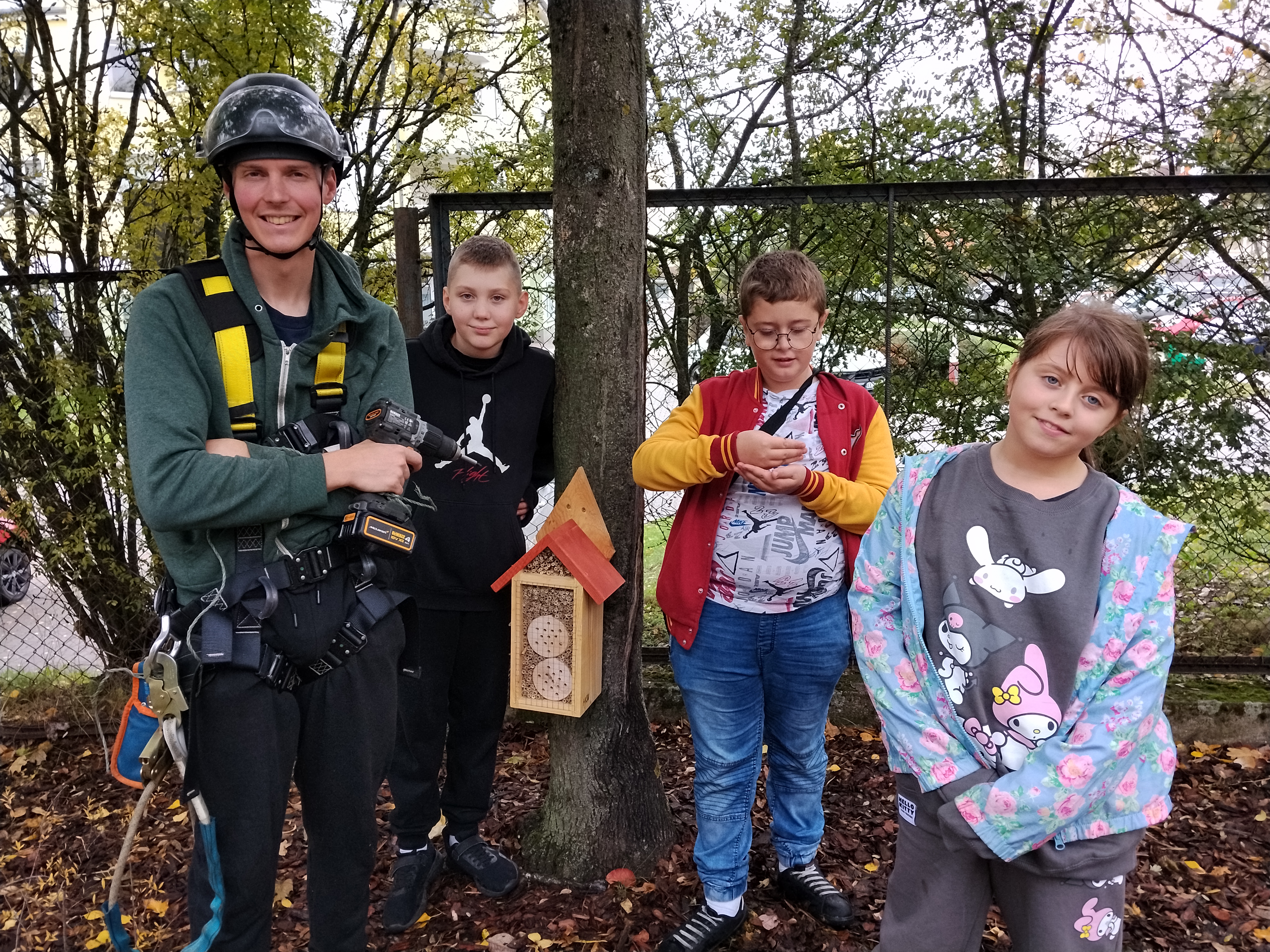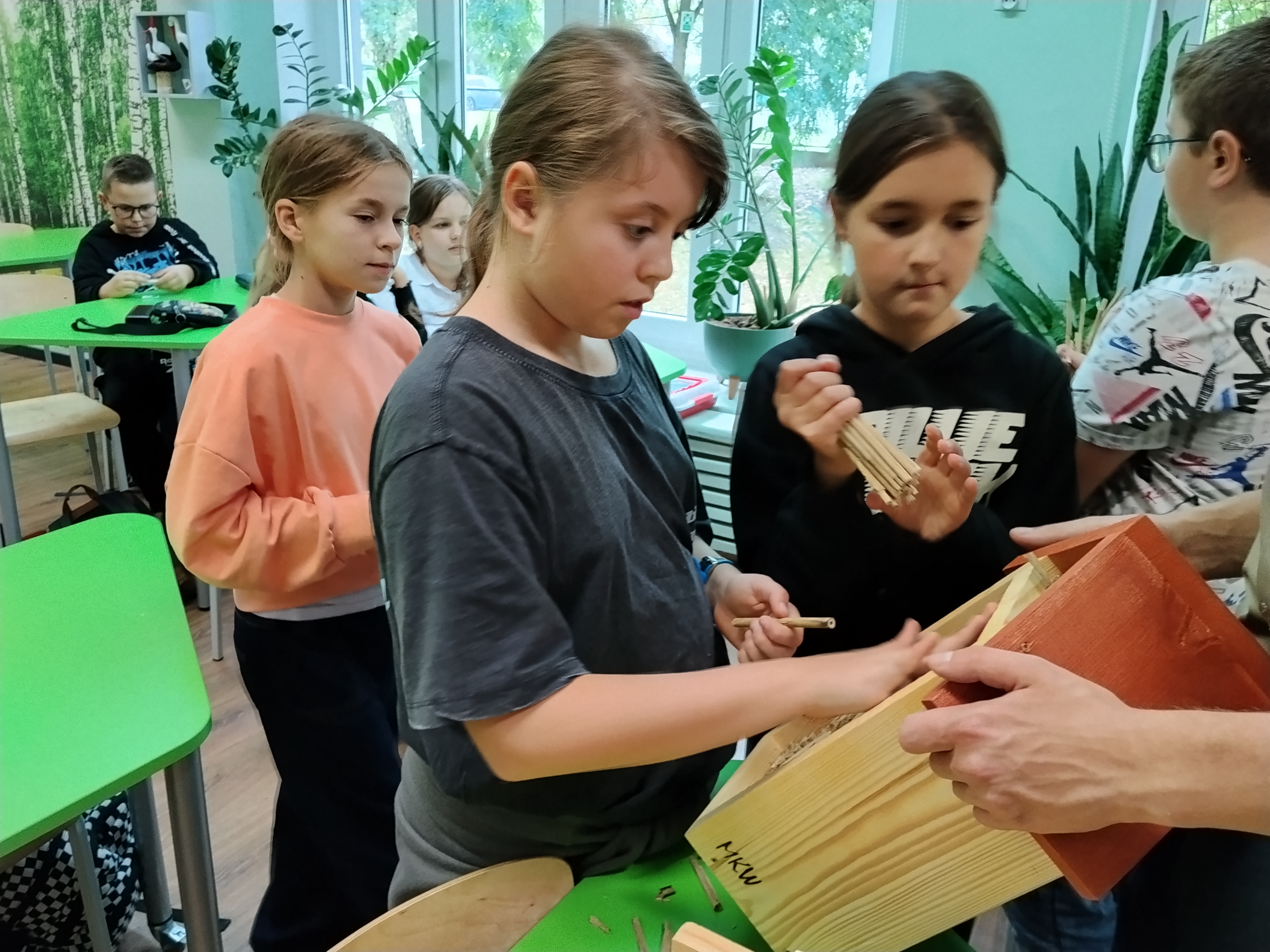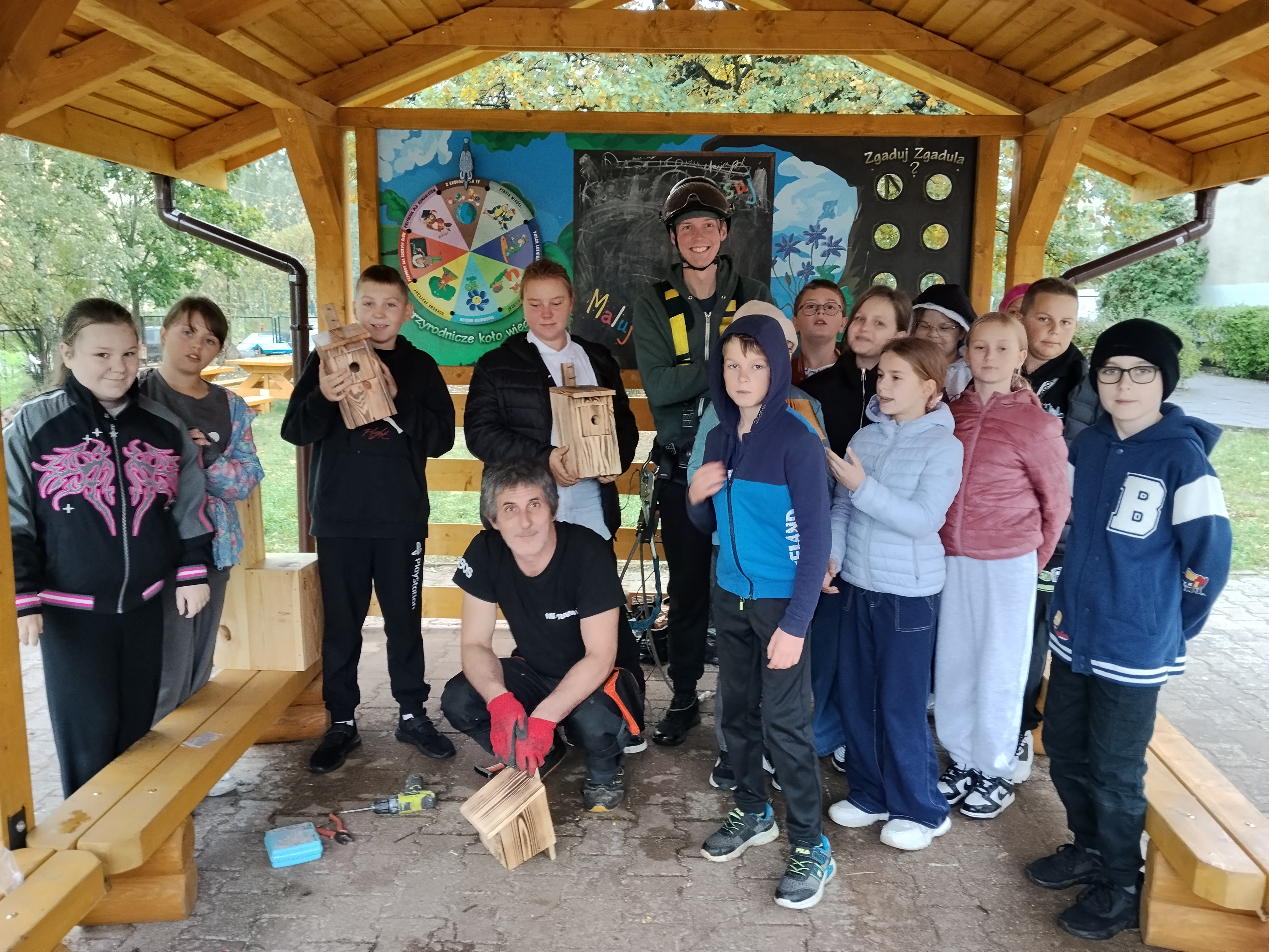 Uczniowie klasy 4D wraz z wychowawcą uczestniczyli w niezwykłej lekcji przyrody. Pan Antoni Białek z Ligii Ochrony Przyrody przeprowadził zajęcia na temat schronień i pomocy zwierzętom z otoczenia szkoły. Podsumowaniem zajęć było uzupełnienie budki dla owadów przez uczniów i umieszczenie trzech budek (dla nietoperzy, dla owadów i dla pełzaczy) na drzewach na terenie naszej szkoły. Wiosną uczniowie zagospodarują tereny wokół budek sadząc kwiaty. Przy okazji pan Antoni z pomocą naszego pana Przemka powiesili budki dla ptaków, które zostały zakupione w ramach projektu EKO-OGRÓD – rajskie miejsce w miejskiej dżungli, który został dofinansowany z programu EKOLUB-Lubuskiego Programu Edukacji Ekologicznej realizowanego przez Wojewódzki Fundusz Ochrony Środowiska i Gospodarki Wodnej. Bardzo dziękujemy dla LOP i pana Antoniego za zorganizowanie zajęć i otrzymane budki:)