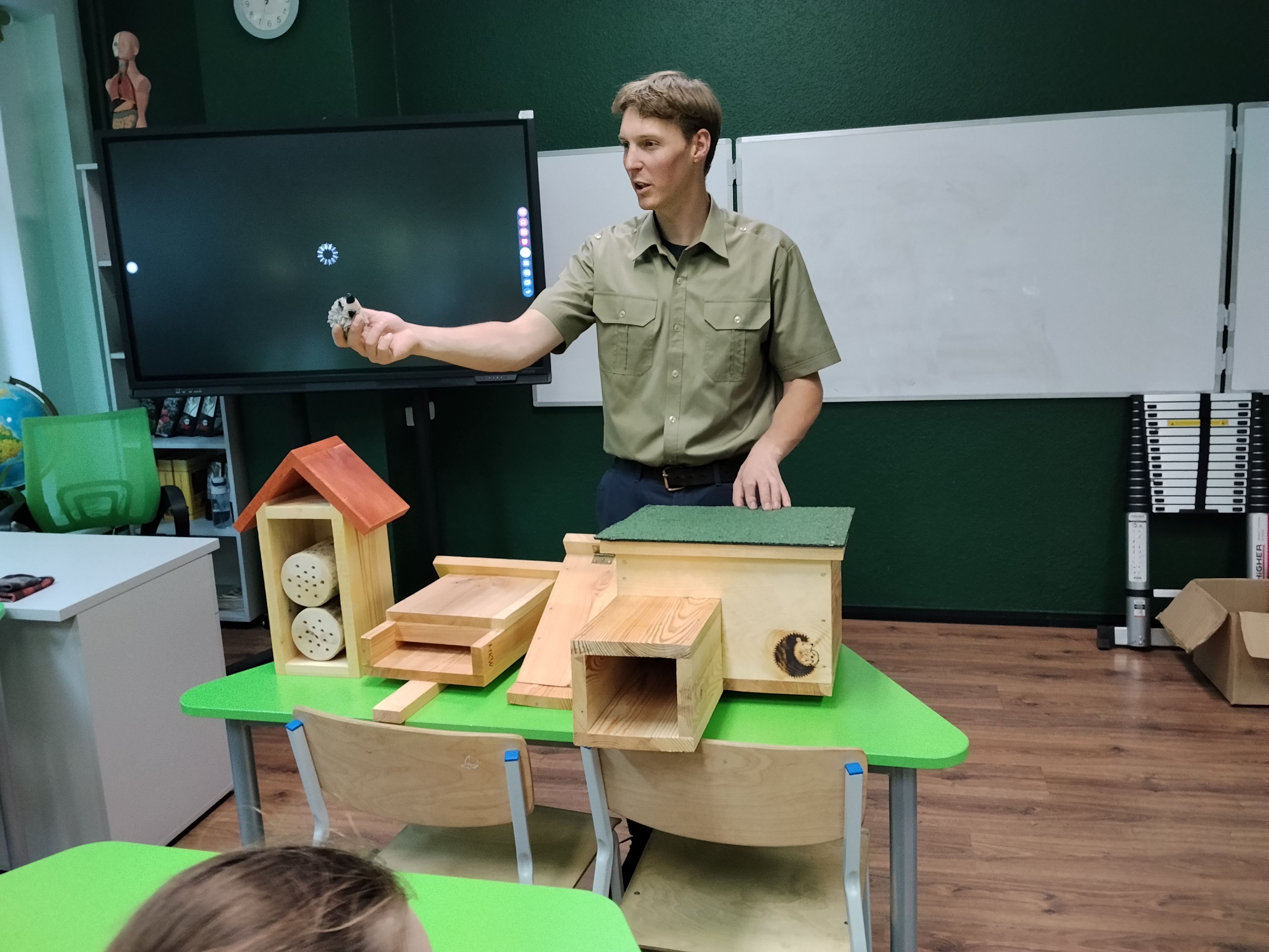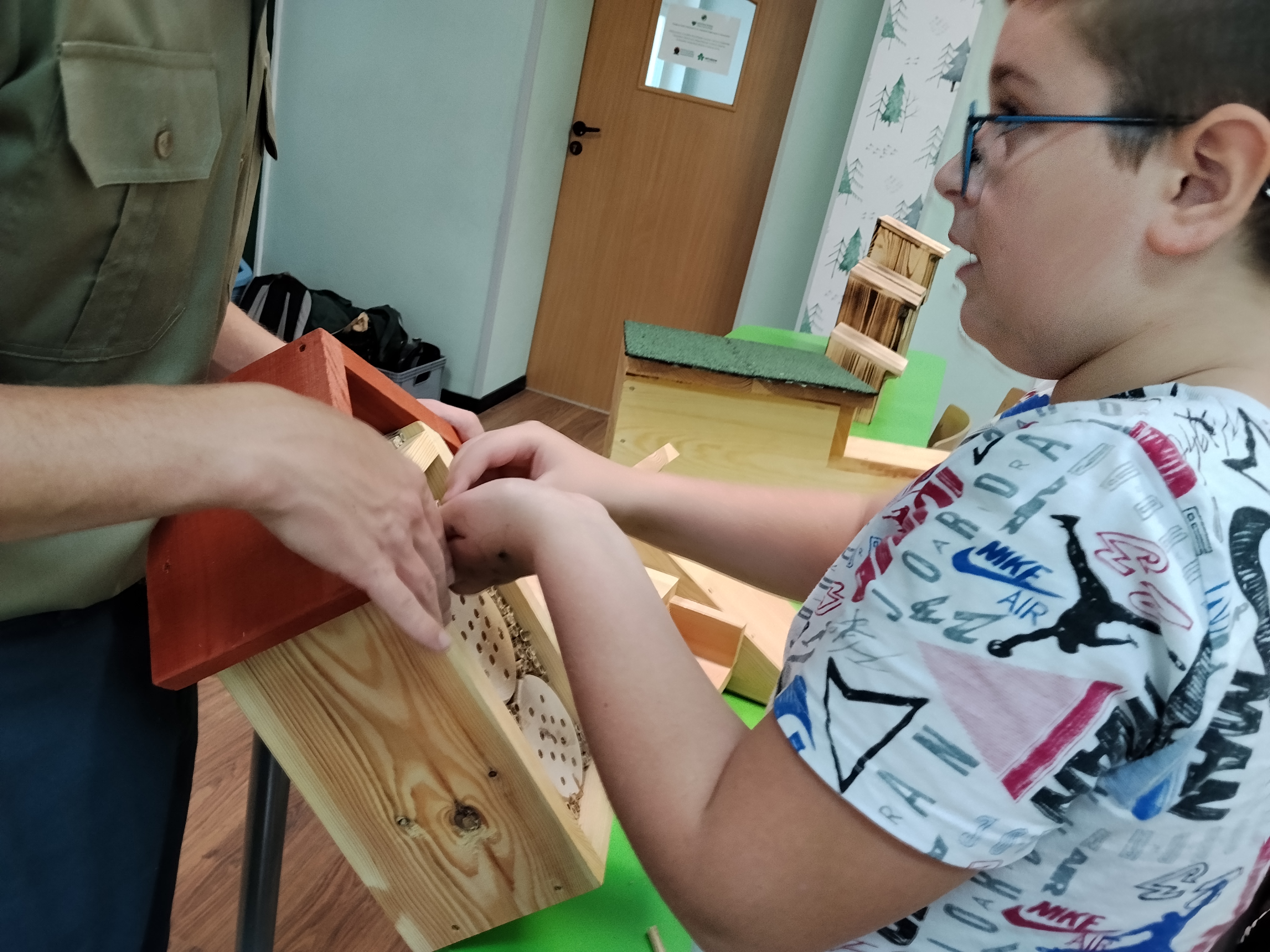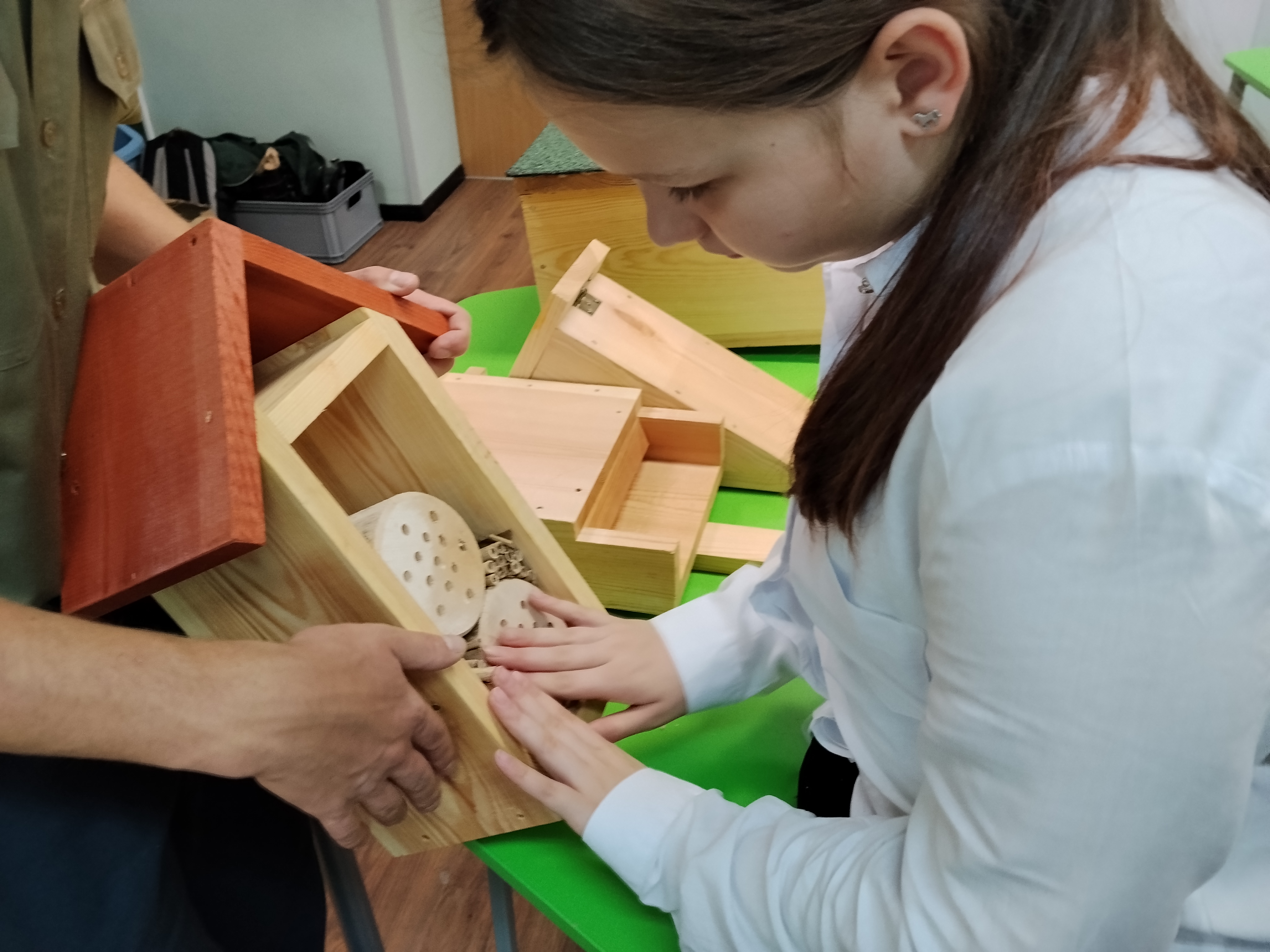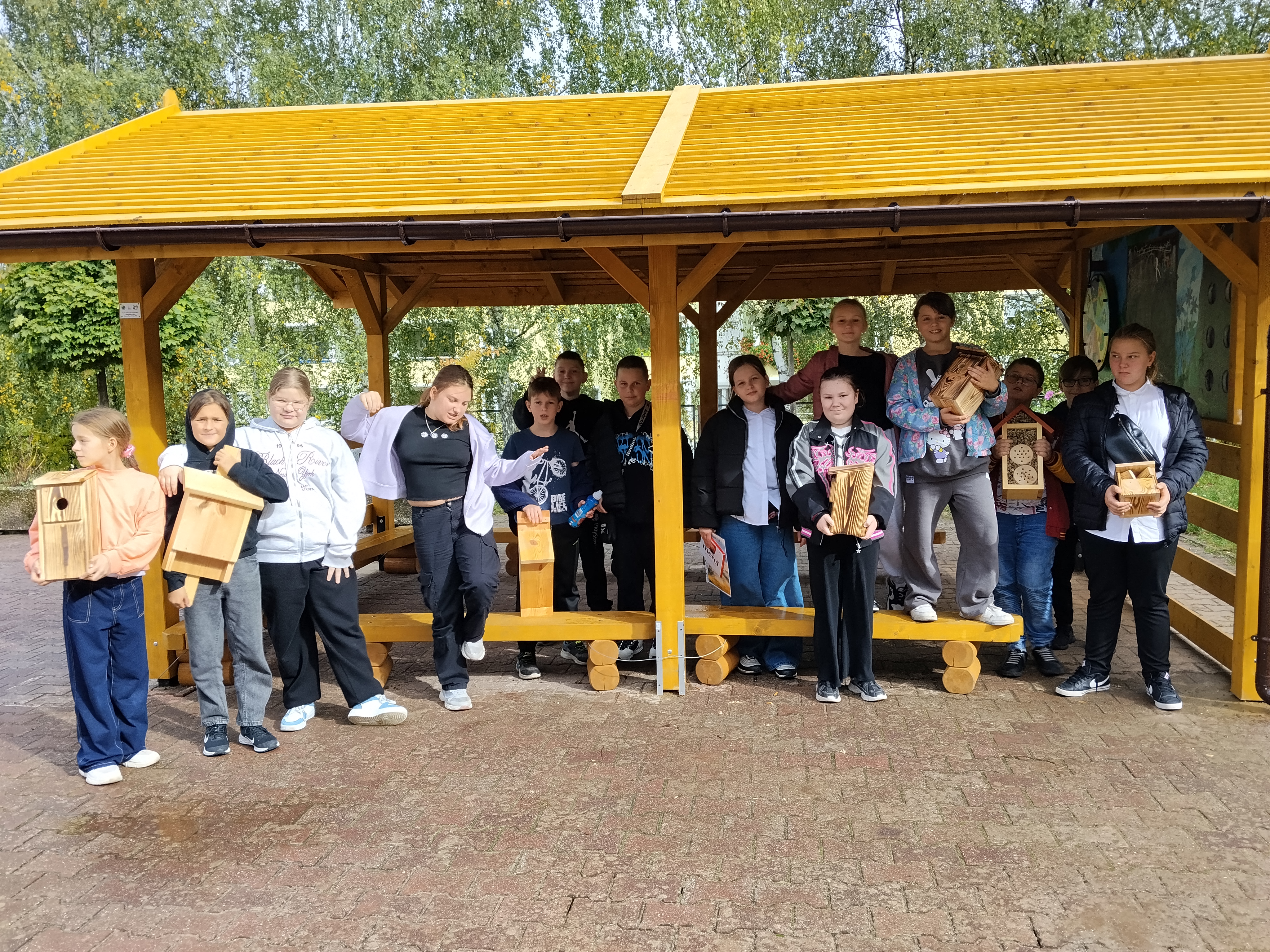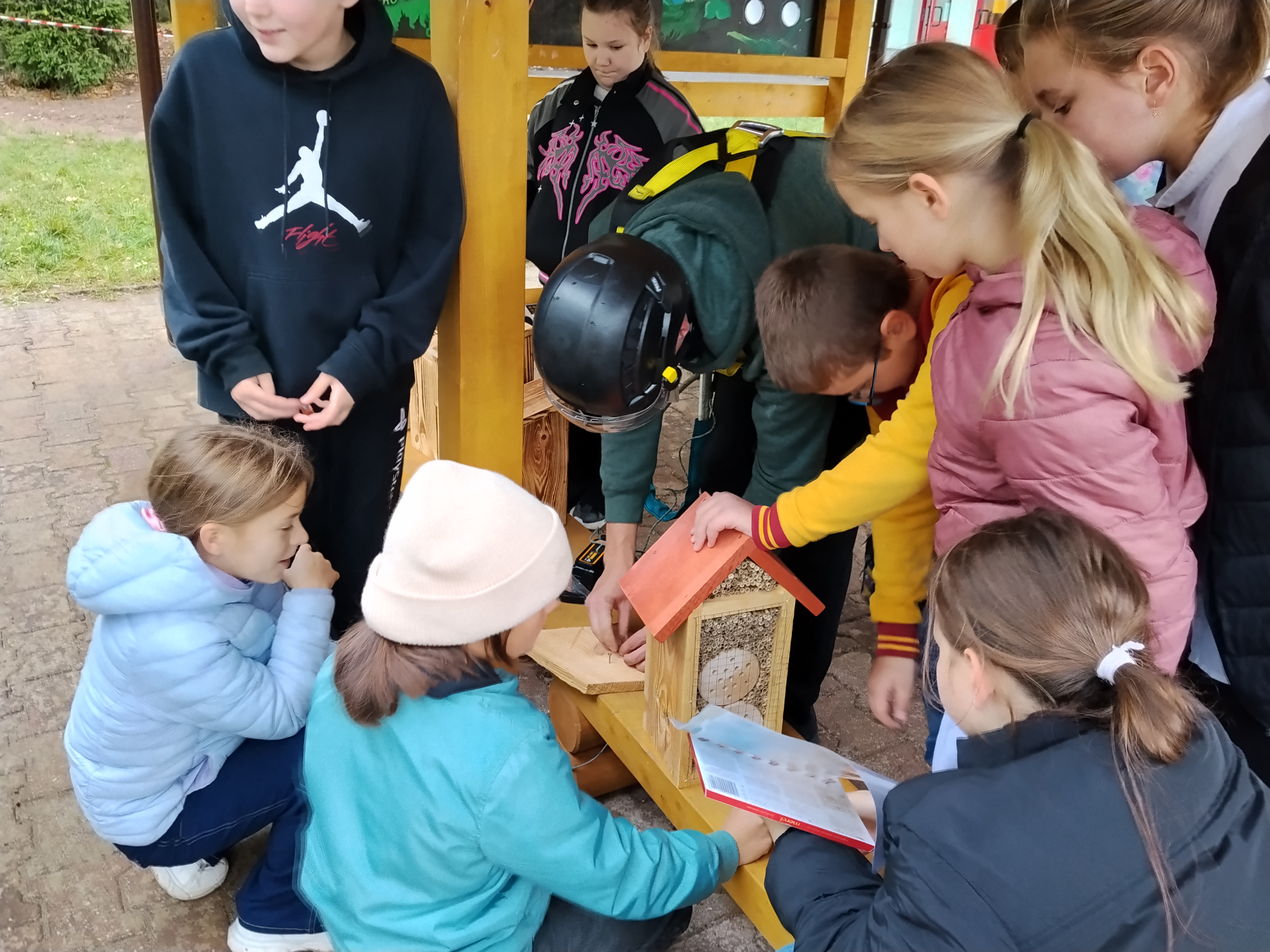 Uczniowie klasy 4D wraz z wychowawcą uczestniczyli w niezwykłej lekcji przyrody. Pan Antoni Białek z Ligii Ochrony Przyrody przeprowadził zajęcia na temat schronień i pomocy zwierzętom z otoczenia szkoły. Podsumowaniem zajęć było uzupełnienie budki dla owadów przez uczniów i umieszczenie trzech budek (dla nietoperzy, dla owadów i dla pełzaczy) na drzewach na terenie naszej szkoły. Wiosną uczniowie zagospodarują tereny wokół budek sadząc kwiaty. Przy okazji pan Antoni z pomocą naszego pana Przemka powiesili budki dla ptaków, które zostały zakupione w ramach projektu EKO-OGRÓD – rajskie miejsce w miejskiej dżungli, który został dofinansowany z programu EKOLUB-Lubuskiego Programu Edukacji Ekologicznej realizowanego przez Wojewódzki Fundusz Ochrony Środowiska i Gospodarki Wodnej. Bardzo dziękujemy dla LOP i pana Antoniego za zorganizowanie zajęć i otrzymane budki:)