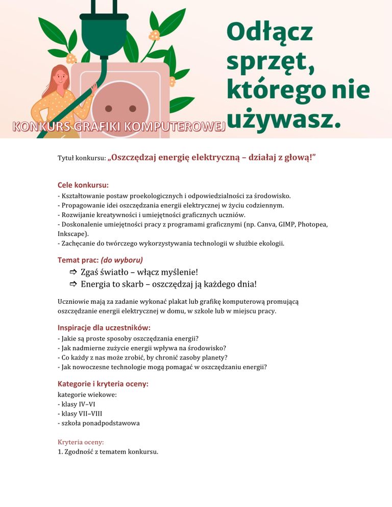 Uczniowie mają za zadanie wykonać plakat lub grafikę komputerową promującą oszczędzanie energii elektrycznej w domu, w szkole lub w miejscu pracy.